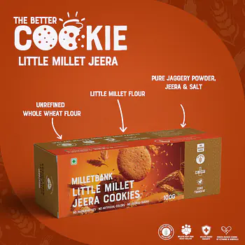 Our Little Millet Jeera Cookies are packed with wholesome goodness to give you a guilt-free indulgence. They are made with Little Millet and jaggery and are free from dairy, Maida, baking soda and trans-fat.